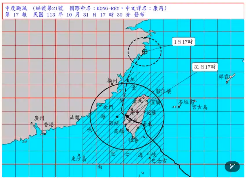 據《ettoday新聞雲》報導,氣象署在下午5點半的警報指出,強台康芮已經減弱變為「中度」颱風,暴風圈也縮小,原本7級暴風半徑從320公里縮小到280公里。