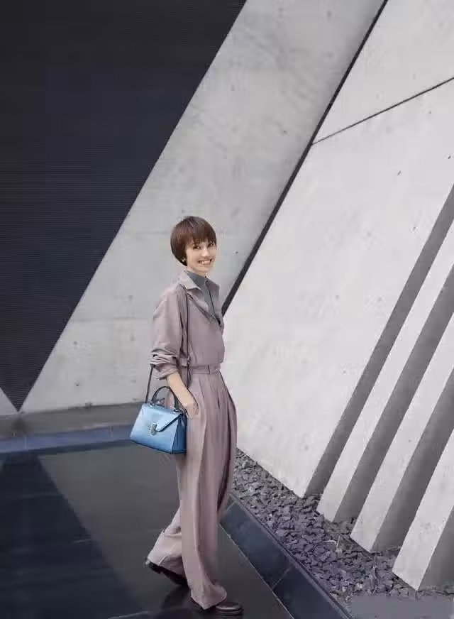 深灰紫色的襯衫+闊腿褲,更知性和優雅,也會更成熟、穩重,所以在搭配時,淺藍色的小包包可以進行對整套的色彩提亮,顯青春。