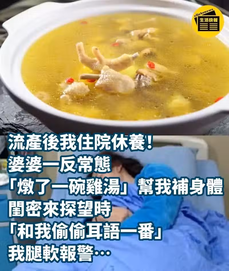 流產後我住院休養! 婆婆一反常態「燉了一碗雞湯」幫我補身體,閨密來探望時「和我偷偷耳語一番」我腿軟報警…