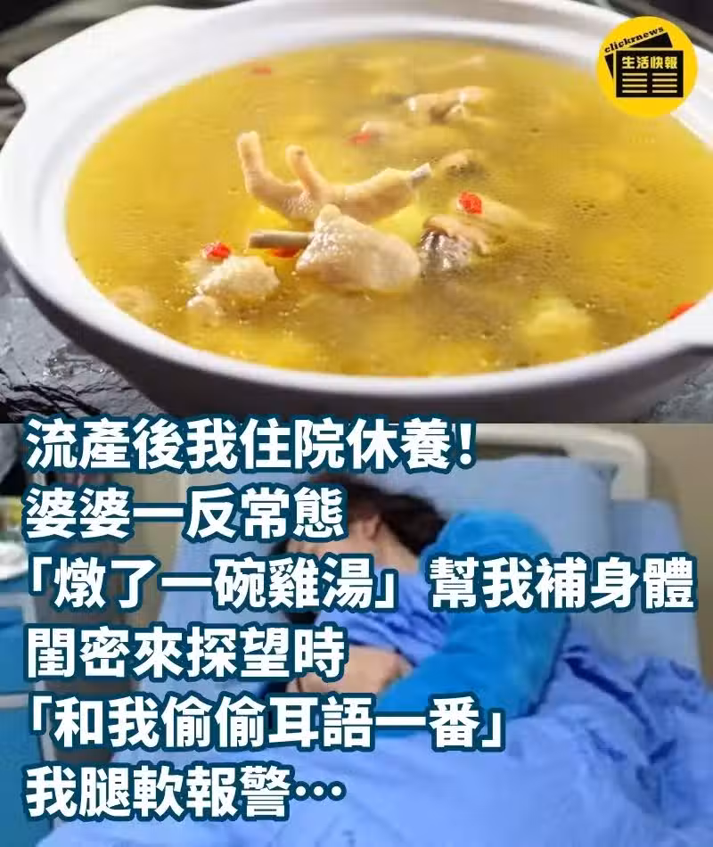 流產後我住院休養! 婆婆一反常態「燉了一碗雞湯」幫我補身體,閨密來探望時「和我偷偷耳語一番」我腿軟報警