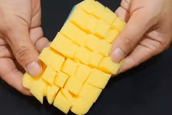 首先我們準備一塊乾淨的百潔布,在百潔布有海綿的一面用美工刀橫豎切開,切成這樣均勻的小方格就可以了,注意不要把百潔布切斷了。