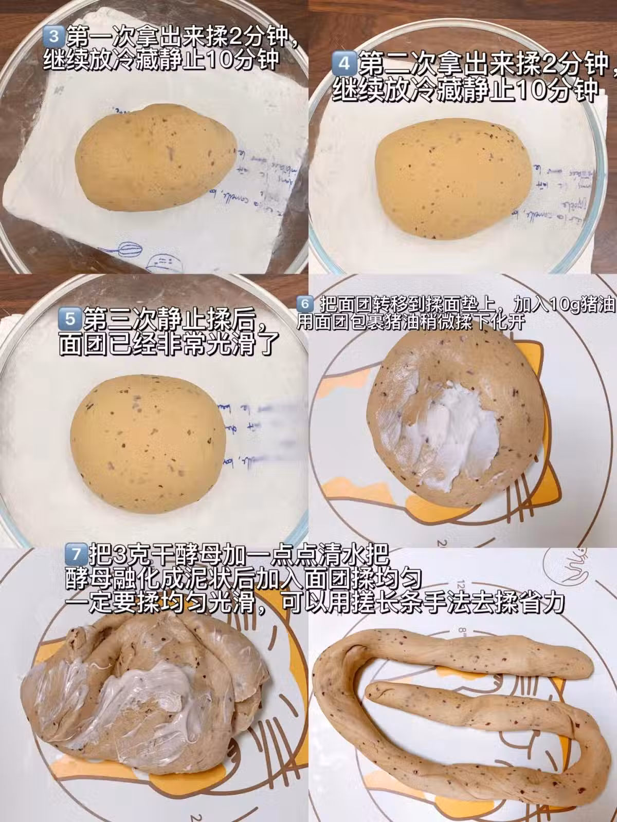 3️⃣把麵糰轉移到揉面墊上,加入10g豬油,用麵糰包裹豬油稍微揉下化開,把3克乾酵母加一點點清水把酵母融化成泥狀後加入麵糰揉均勻揉光滑,可以用搓長條手法去揉,更省力