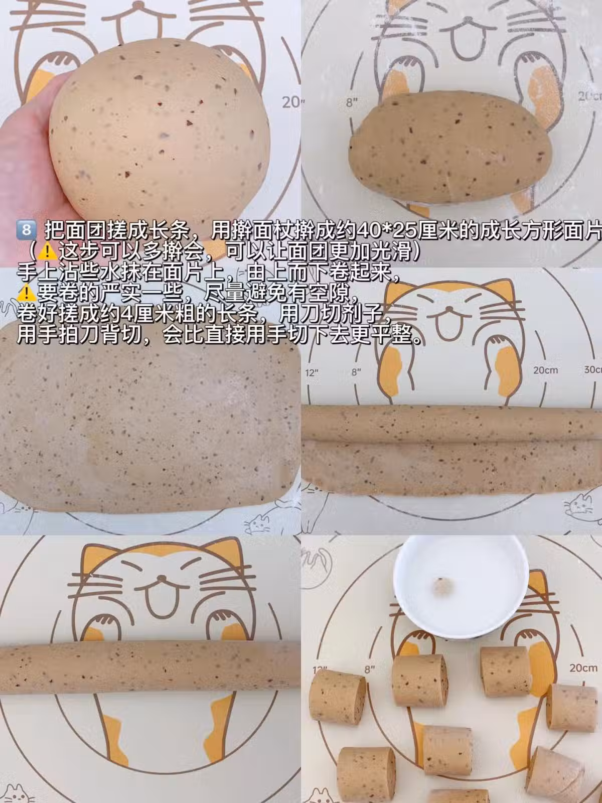 4️⃣把麵糰搓成長條,用擀麵杖擀成約40*25厘米的成長方形面片(⚠️這步可以多擀會,可以讓麵糰更加光滑)手上沾些水抹在面片上,由上而下捲起來,⚠️要卷的嚴實一些,儘量避免有空隙(這樣做出來的饅頭富有層次帶有嚼勁)卷好搓成約4厘米粗的長條,用刀切劑子,用手拍刀背切,會比直接用手切下去更平整。
