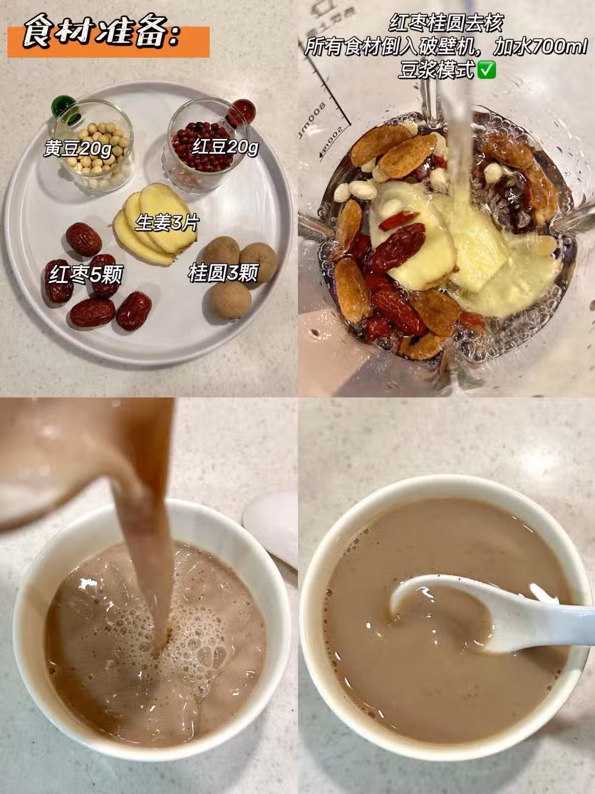 ✔️做法:紅棗桂圓去核,所有食材倒入破壁機,加水700ml,豆漿模式✅
