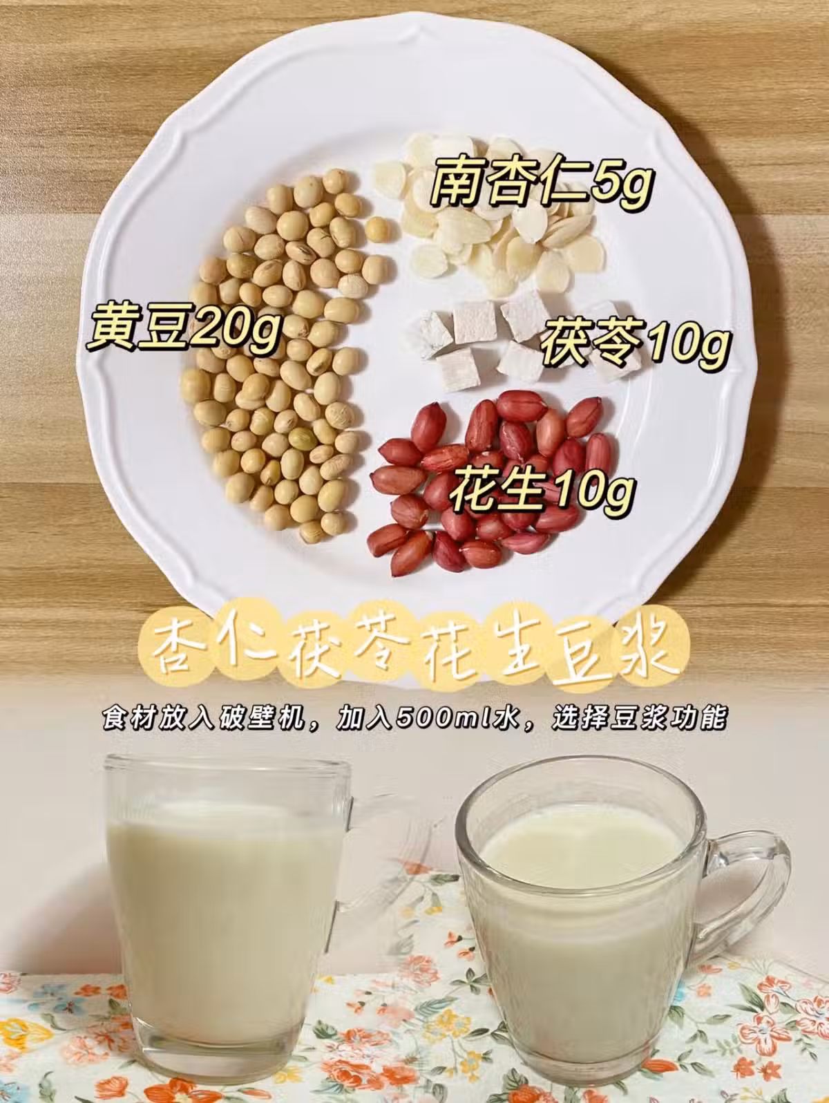 南杏仁潤腸通便、美白養膚,茯苓健脾補中、寧心安神,花生延緩衰老