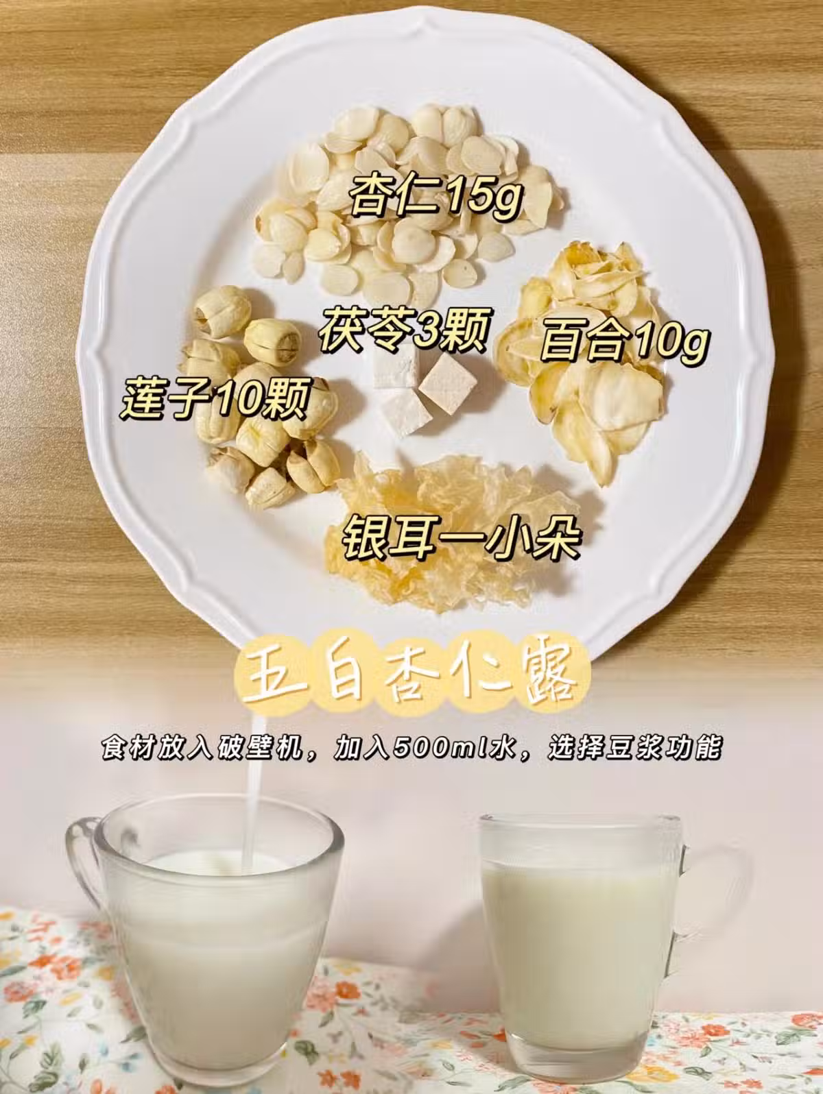 南杏仁美白養膚,百合潤燥止咳、防癌抗癌,茯苓健脾補中,銀耳滋陰潤肺,蓮子清熱降火