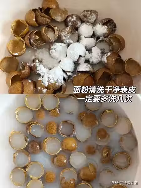 桂圓皮加麵粉浸泡,清洗乾淨。