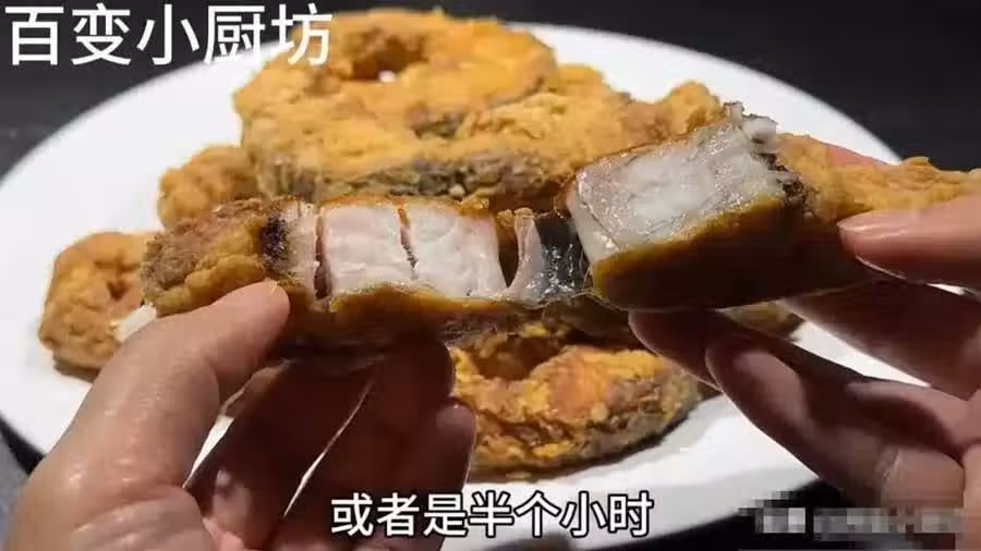 哇,看起來真是太誘人了,聞起來超級香的,這樣炸出來的魚塊裡面的魚刺都是酥脆的,外面這一層脆皮非常的酥脆,而且裡面已經形成了空心,掰開之后里面的魚肉白白嫩嫩的,而且非常入味。如果你只是腌了20分鐘或者是半個小時,那麼做出來的魚塊是掛單無味道,看一下外面的這一層魚皮,輕輕一撕,整個都掉了,忍不住就大口大口的吃了起來。