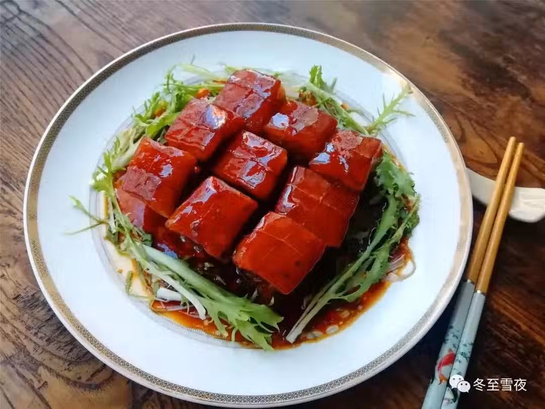 【東坡肉】 所需材料:五花肉1000克、鹽適量、蔥1段、姜1塊、大蒜2瓣、花雕酒250克、生抽醬油2湯匙、紅燒醬油2湯匙、冰糖20克、水澱粉適量