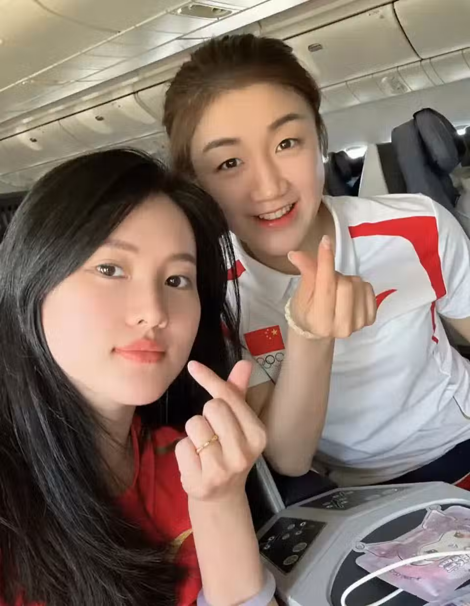 巴黎奧運結束,中國代表團回國,陳夢社交平台曬了自拍照,她的好閨蜜是全紅嬋的教練,美女陳若琳。兩人一張照片一起比心,另一張照片是剪刀手。陳若琳在社媒說,羨慕陳夢的睡眠質量。