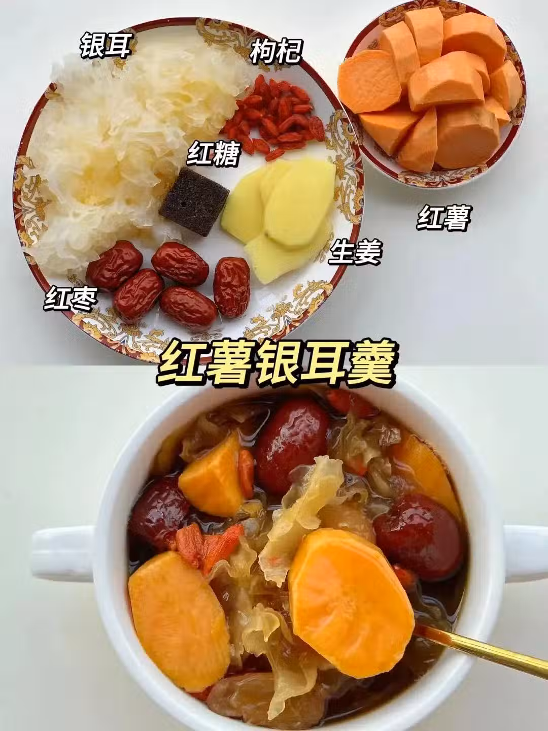 紅薯、銀耳、紅棗、枸杞、生薑、紅糖