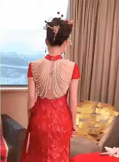 視訊開頭,新娘緩緩走進房間,身穿一襲紅色的中式旗袍,長裙貼合著她纖細的身材,勾勒出優美的線條。
