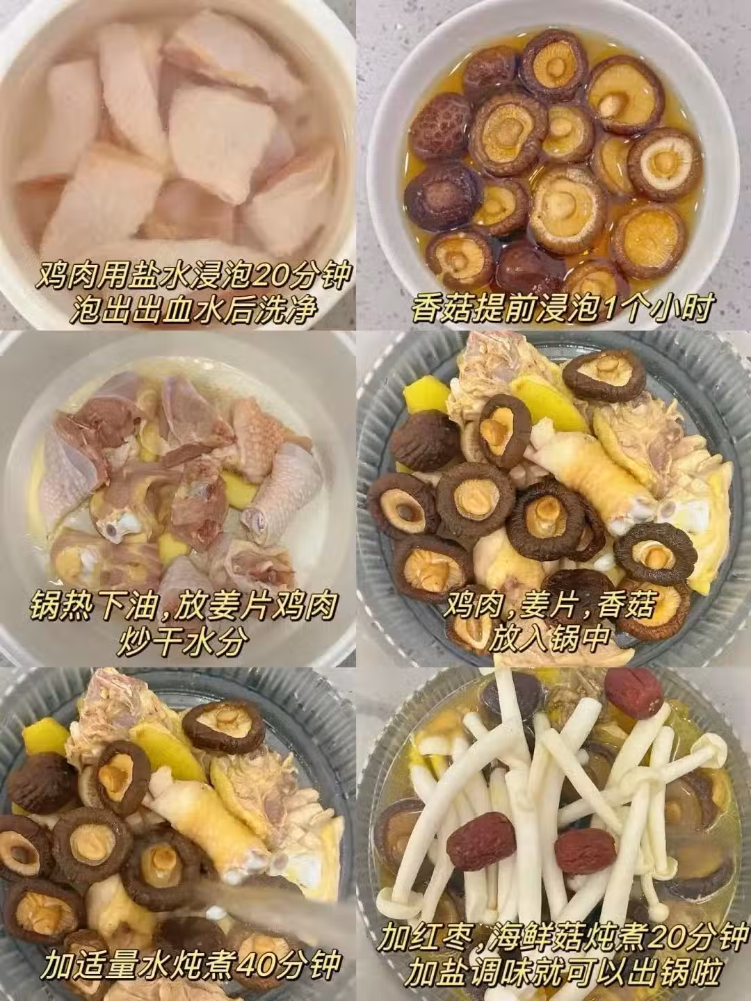 ①.雞肉用鹽水浸泡出血水後洗凈,香菇用溫水提前浸泡一小時