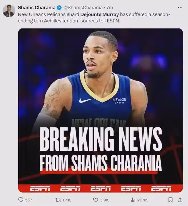 近日鵜鶘116-118惜敗綠凱的比賽,首節默里無對抗受傷隨即退出比賽,之後就傳出了如上所述賽季報銷的消息。