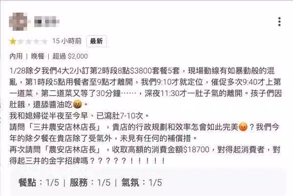 此外,點餐內容也被限制,結果團圓飯吃到半夜12點,最後的水果還是「切一半的櫻桃」,讓消費者大傻眼;有其他消費者留言「上來的A5和牛完全是冷的,在我們反應後一位主管人員過來致歉,最後在我們要結帳時,光結帳又等了快半小時」。