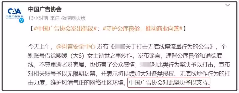 緊接著,其他的平台也跟進,張蘭的微博直播功能被關閉。主流媒體紛紛下場批判這種炒作的行為,當日中國廣告協會表示堅決予以支持。