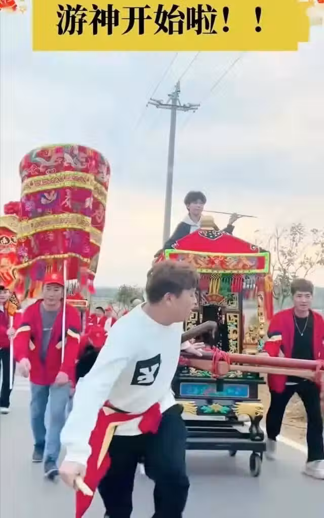 全紅嬋家裡擺宴席鬧元宵,照片懸掛在游神車,哥哥表演穿令箭習俗