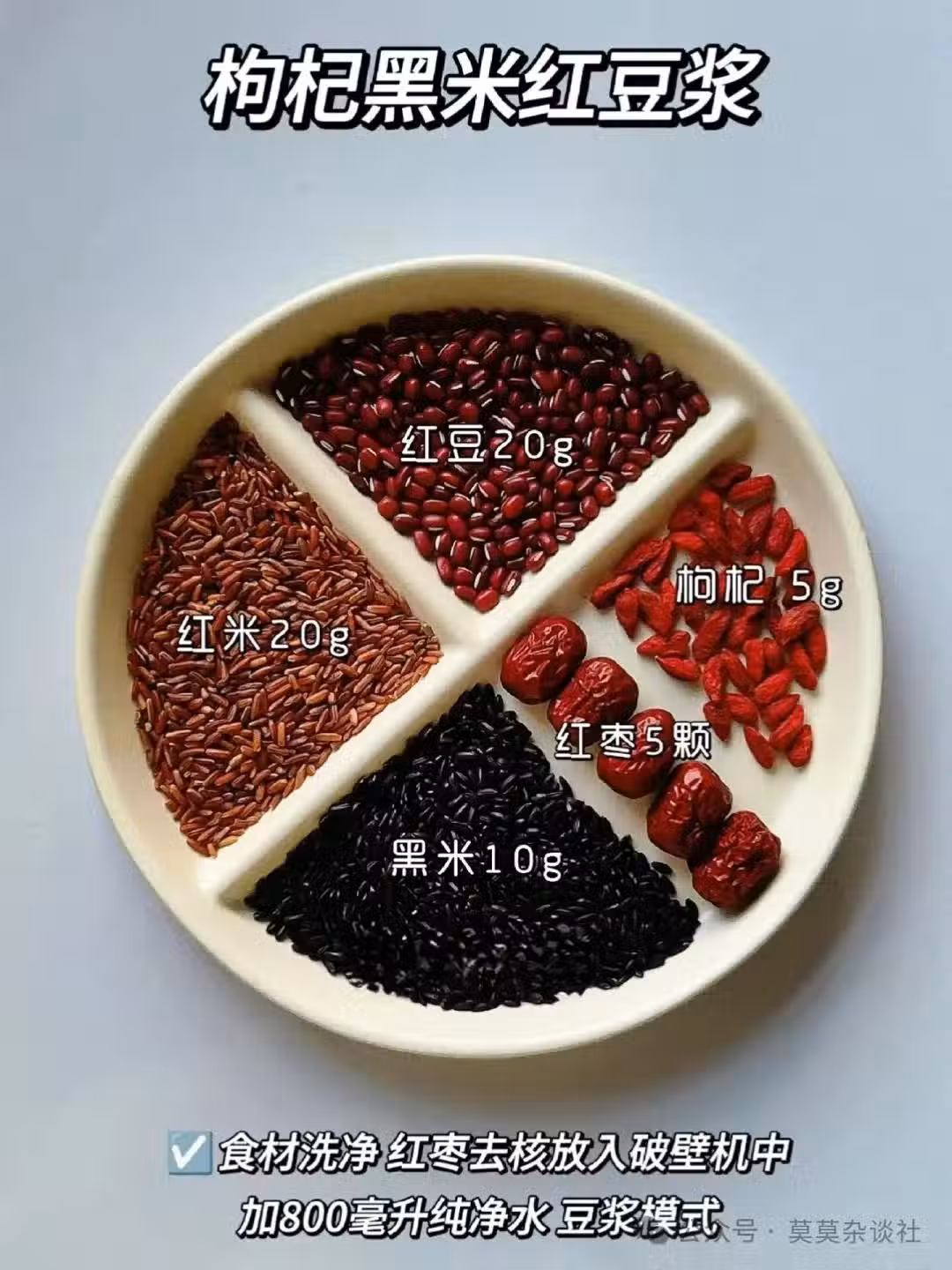 食材:紅豆 20g | 紅米 20g | 黑米 10g | 枸杞 5g | 紅棗 5顆