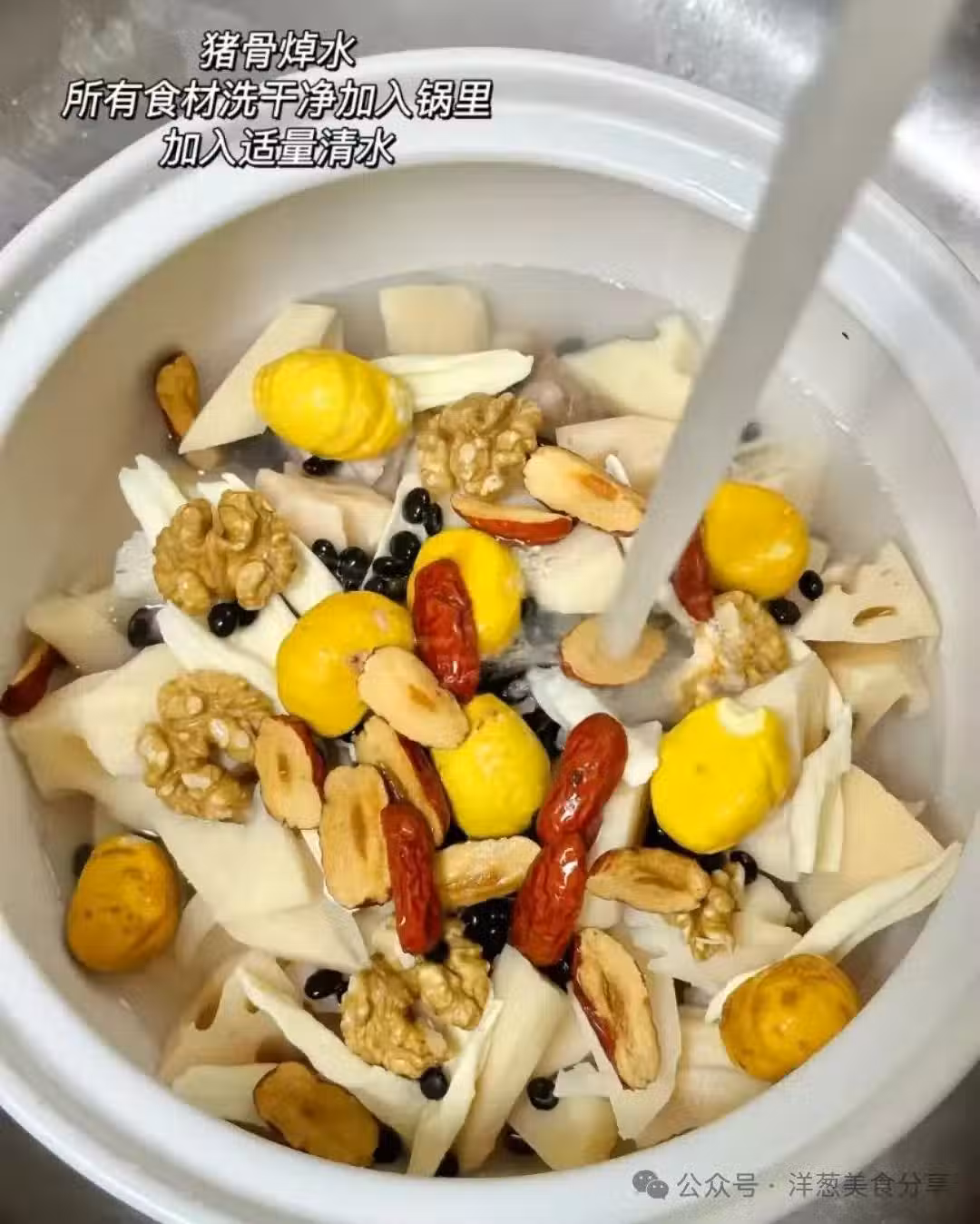 豬骨焯水,食材洗凈一併放入鍋里,加入適量的清水