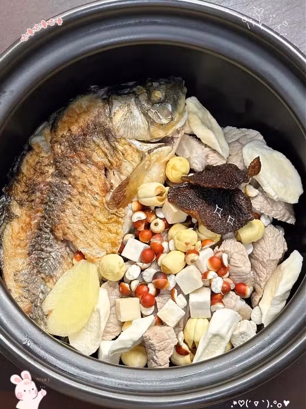 2. 把煎好的鯽魚、焯水後的瘦肉、茯苓、山藥、蓮子、芡實、陳皮和薑片一起放入鍋中,加入適量清水,水量要沒過所有食材。