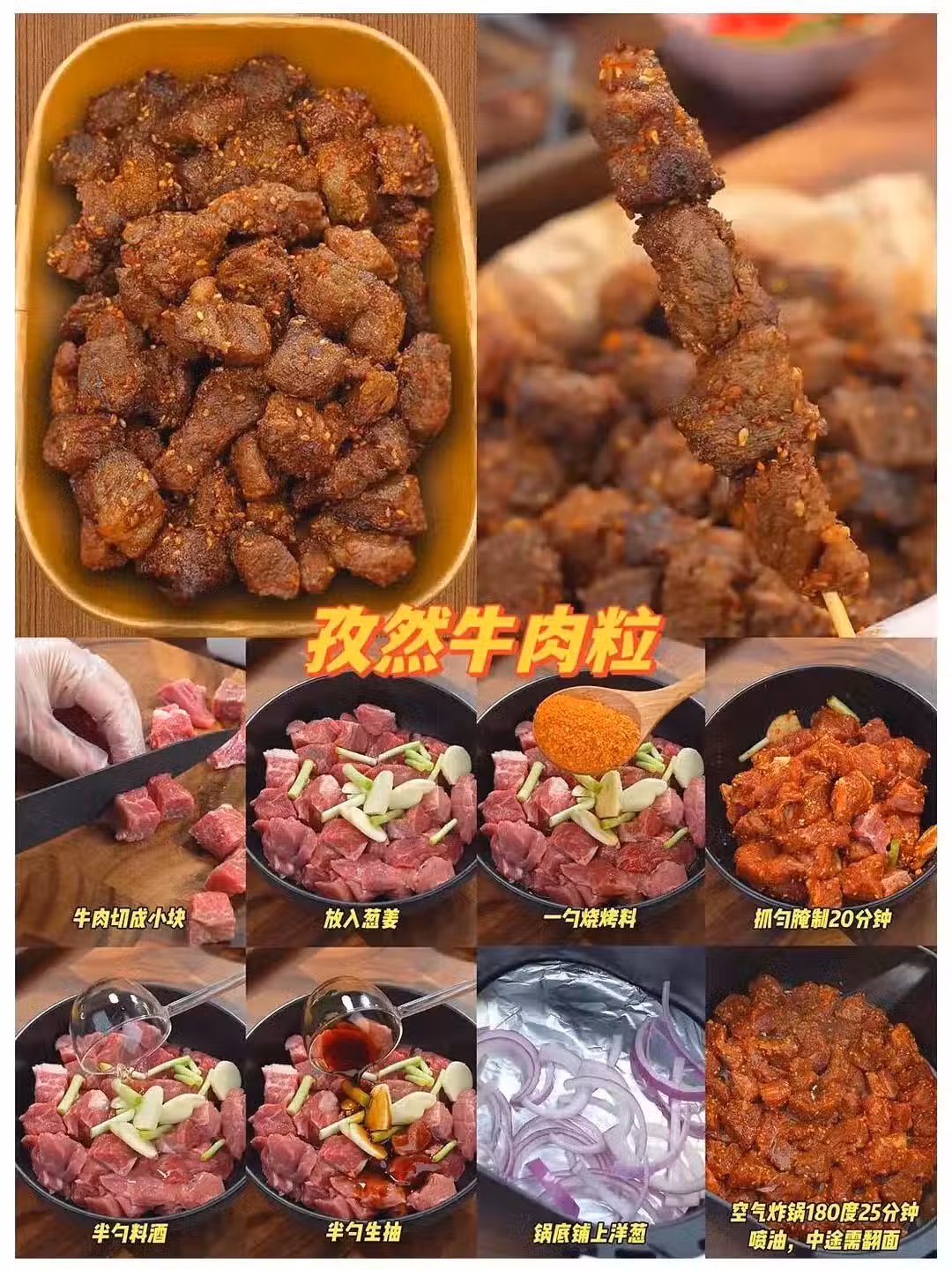 新疆燒烤攤老闆親傳!牛肉粒要帶著點肥邊,烤得滋滋冒油時撒孜然。建議多烤點,否則容易引發家庭"肉粒爭奪戰"。