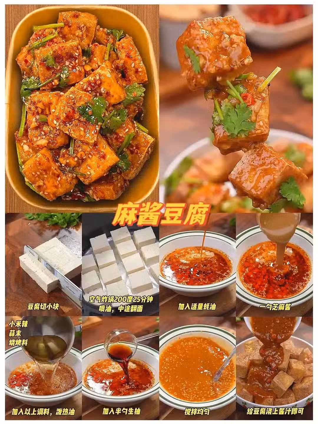老北京遇上日式料理!嫩豆腐切塊烤出脆皮,淋二八醬(2勺芝麻醬+8勺花生醬)。撒香菜粒是靈魂,信我!