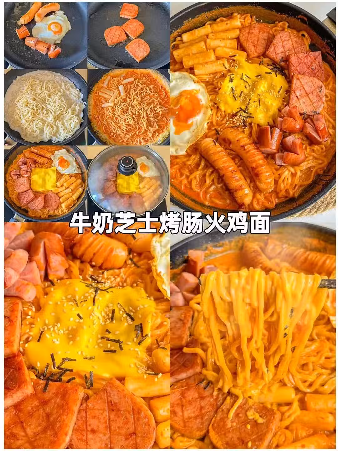 靈感來源:便利店關東煮的隱藏菜單。 做法:牛奶煮麵,加芝士片,煎脆的烤腸午餐肉年糕鋪滿碗。 口感:烤腸的油脂滲進奶香辣醬里,每一口都像在咬會爆汁的辣味奶酪炸彈!(熱量是什麼?我不知道) 雪糕火雞面
