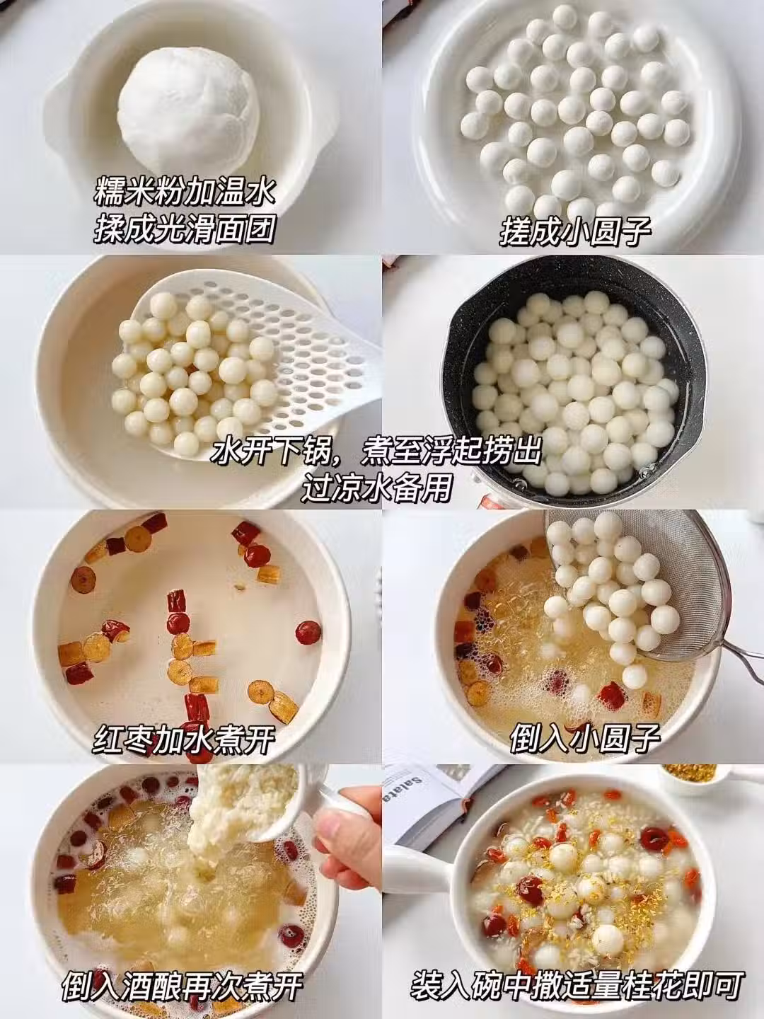 2️⃣水開放進去煮至浮起撈出,紅糖十紅棗兌入清水煮開,放入酒釀煮開