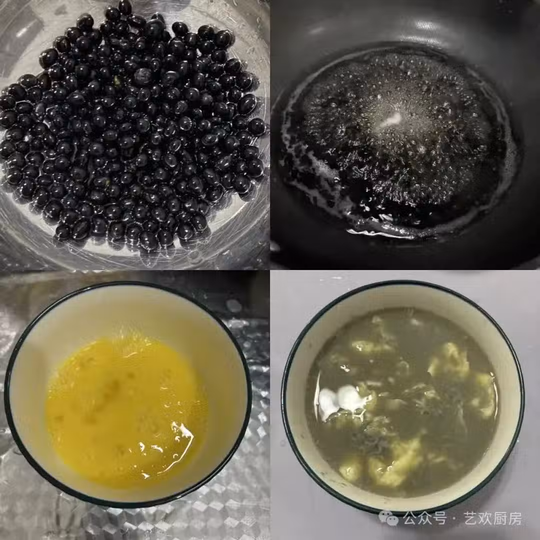 記得黑豆水沖雞蛋,一定要滾燙才好。黑豆水盛入裝有蛋液的碗里,倒扣上一個碟子,讓它燜個三分鐘,蛋花就出現了,溫溫暖的時候食用!