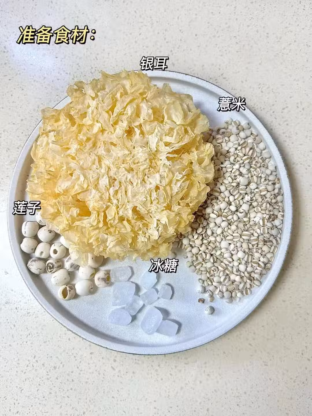 銀耳40g,薏米100g,蓮子20g,冰糖20g