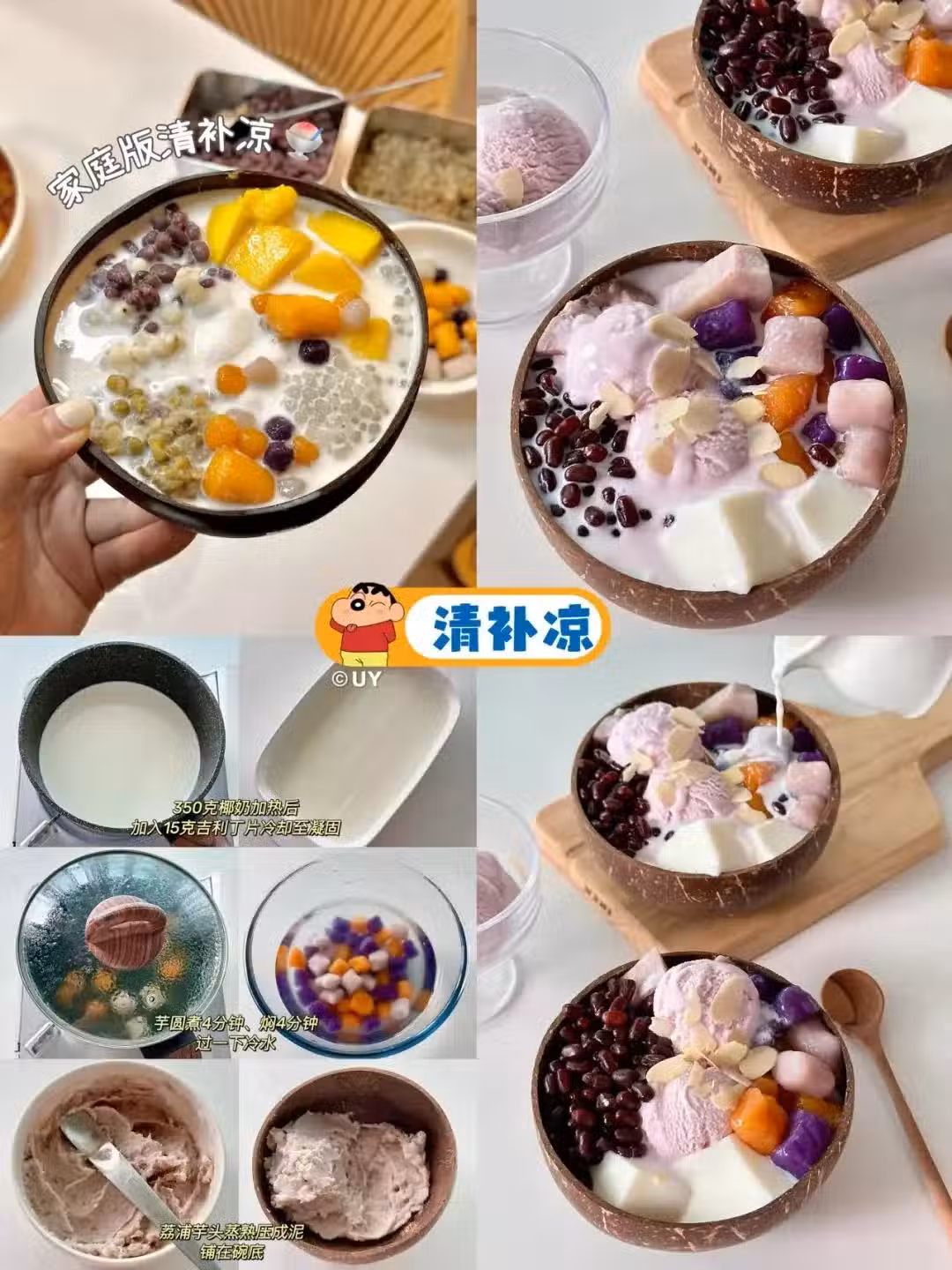椰奶、荔浦芋頭、芋圓、蜜豆、芋泥冰淇淋、吉利丁片或者白涼粉
