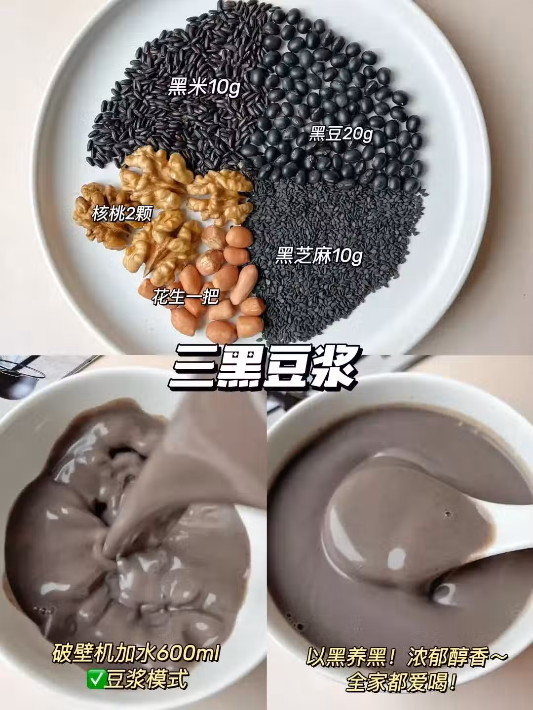 脫髮掉發、髮際線後移、發梢乾枯草……你有沒有受到這些「頭髮焦慮」困擾?其實,頭髮問題就像一棵樹,表面枯黃可能是根系養分不足——想養出髮絲烏黑濃密的光澤感,「內調」比「外養」更重要。 黑豆、黑芝麻等天然食材富含蛋白質、維生素E、花青素和微量元素,能幫助強健髮根、延緩白髮,自古就是養發良材。這些食材打成豆漿,不僅吸收快、口感好,還能根據需求搭配出不同功效。 今天美美給大家推薦9款黑豆漿,一周七天不重樣,助力大家喝出烏黑濃密的好頭髮。 一、三黑豆漿 黑豆補蛋白質,黑米養氣血,核桃花生滋潤防斷裂,適合全家日常飲用。 食材:黑豆20g、黑米10g、黑芝麻10g、核桃2顆、花生10g 做法:所有材料提前浸泡4小時,加600ml清水用破壁機豆漿模式即可。 二、五穀豆漿 紅豆紅棗補血氣,特別適合熬夜後面色暗黃、頭髮脆弱的人群。