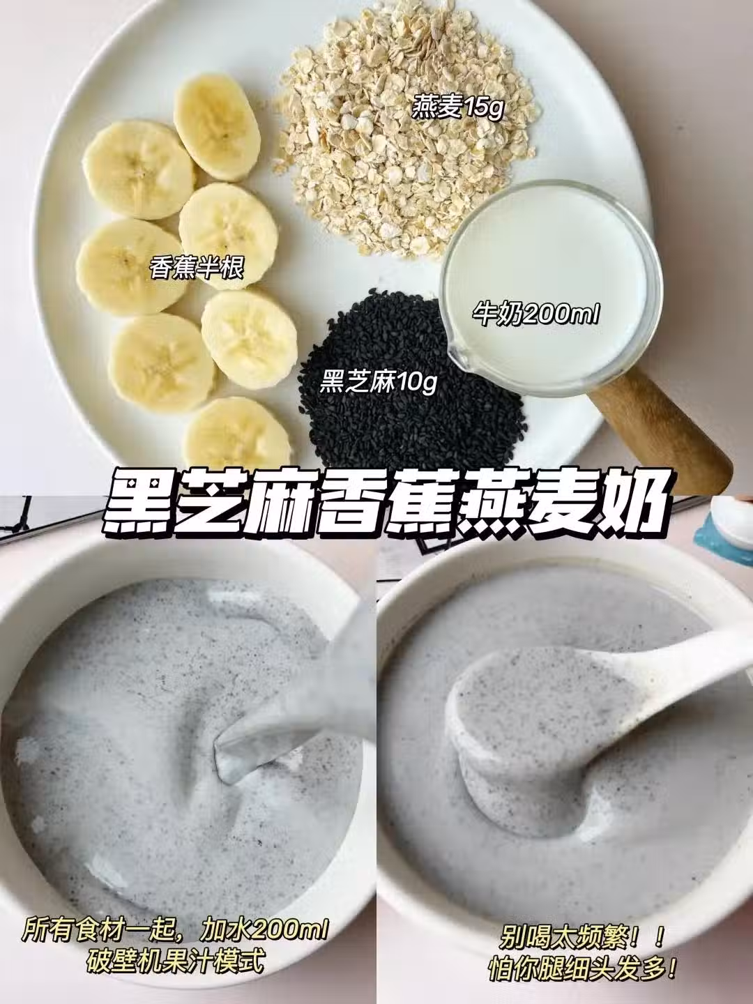 食材:黑芝麻10g、即食燕麥15g、香蕉半根、牛奶200ml 做法:所有材料放入破壁機,加水200ml,選擇果汁模式,2分鐘搞定! 四、濃香黑芝麻糊 糯米增加粘稠度,喝起來像黑芝麻糊,暖胃又飽腹,適合當早餐。