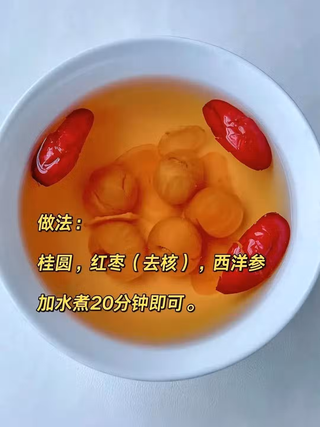 桂圓乾10顆、紅棗3顆(去核)、西洋參6~7片