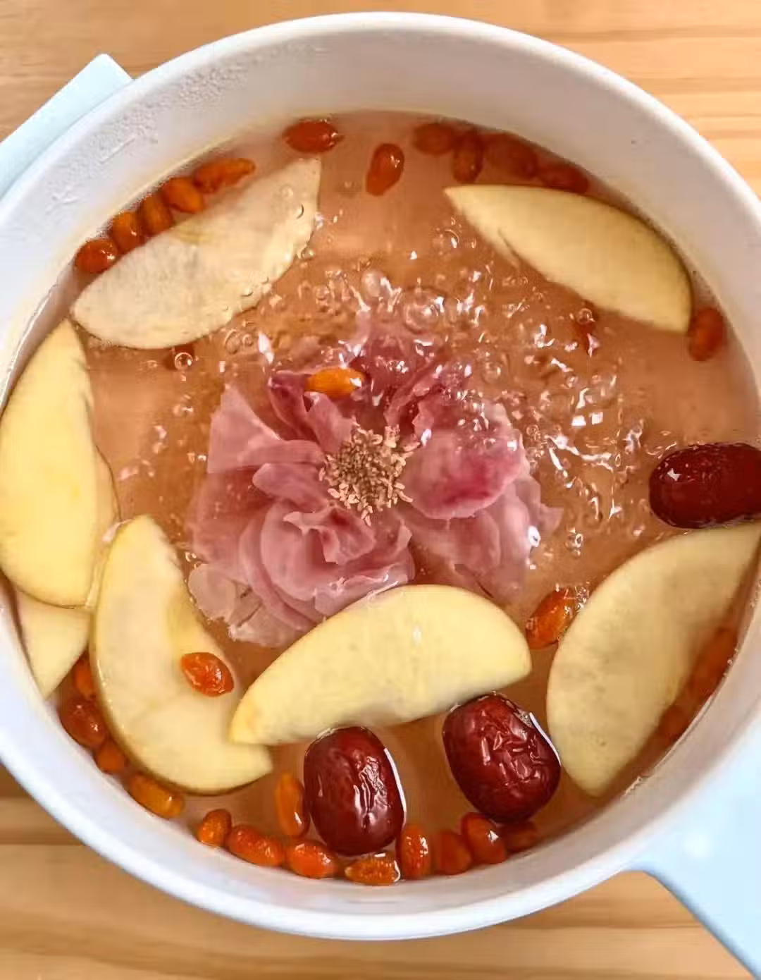 蘋果1個、去核紅棗5顆、陳皮5g、茯苓5g、玫瑰花5朵、枸杞10粒