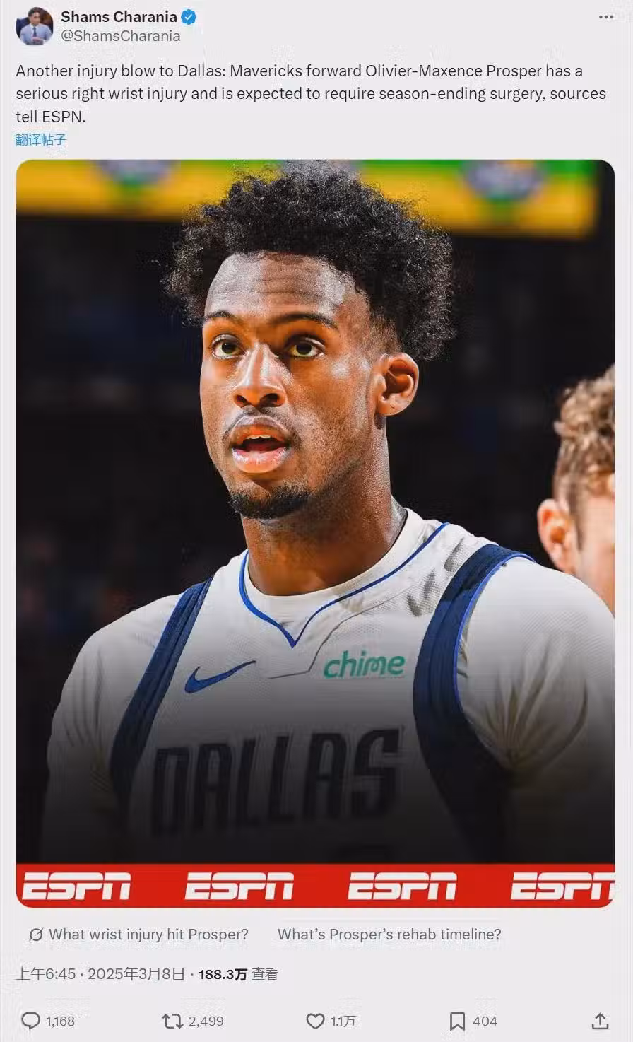 3月8日,據NBA名記Shams報道,獨行俠再遭打擊:球隊前鋒普羅斯珀右手腕嚴重受傷,需要接受手術,本賽季報銷。今天獨行俠主場對陣灰熊,賽前只有7名球員熱身。凱萊布-馬丁緊急復出,獨行俠傷病名單還剩9人!