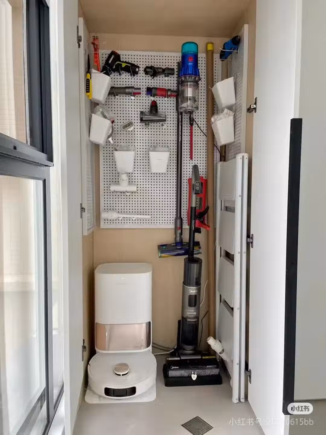 橫向空間不足還可以藉助掛鉤伸縮杆做成抽拉式的收納,抽出所有工具一目了然,底部還能給掃地機器人留一個地方。