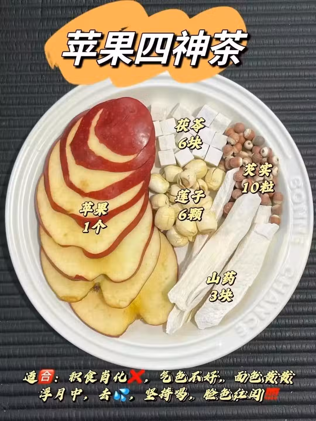 蘋果1個+枸杞10粒+麥冬8粒+紅棗3顆+黃芪6粒
