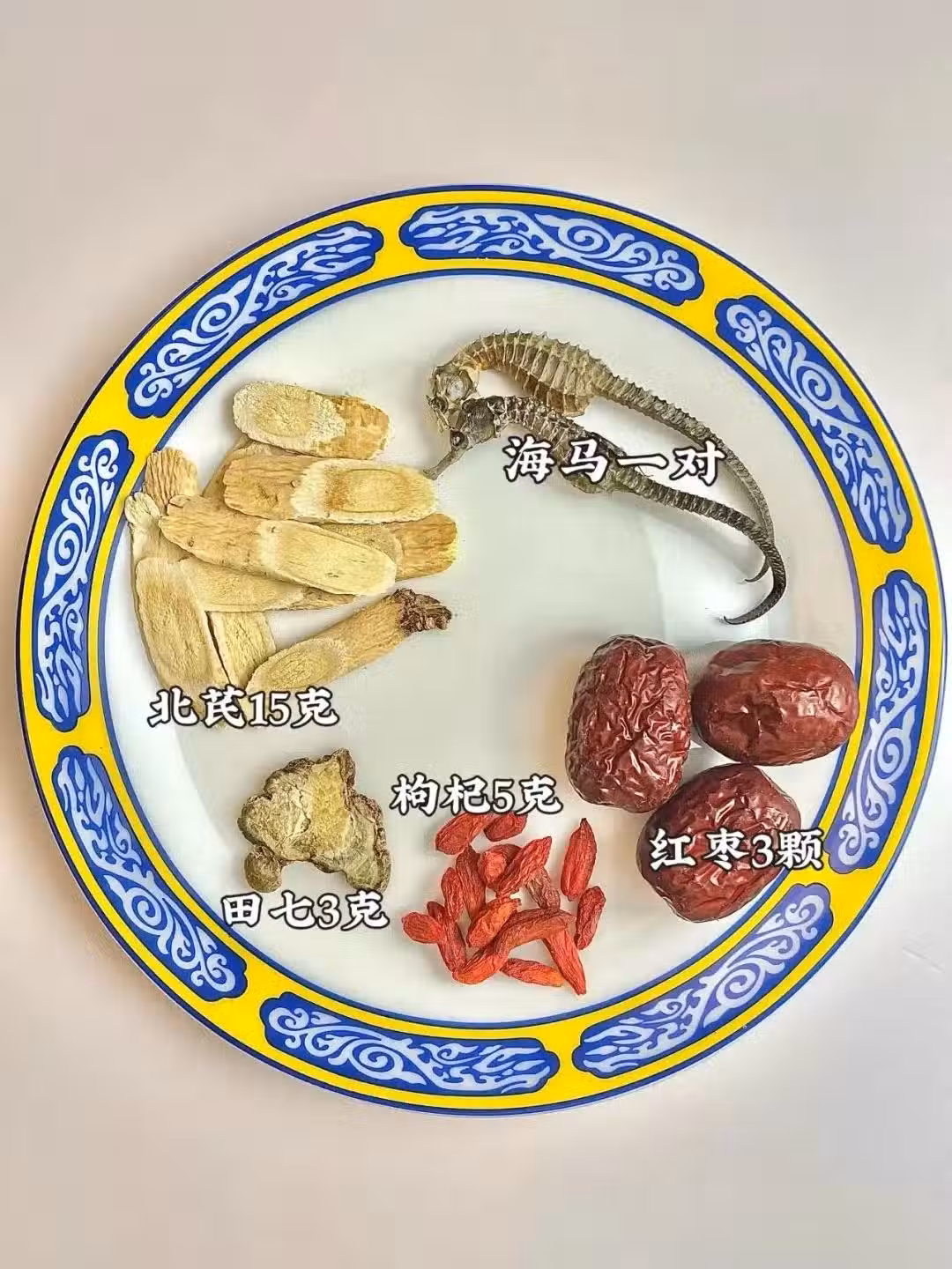 1. 將海馬、北芪、枸杞、紅棗和田七放入燉盅,加入適量清水;