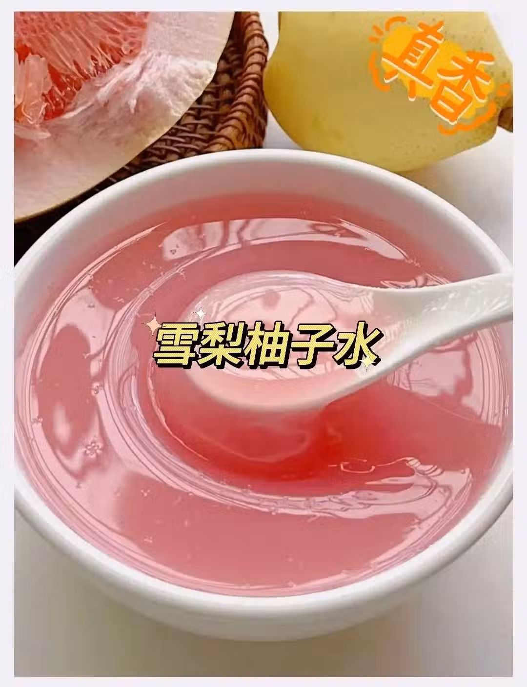 ①取2瓣柚子的果肉,半個雪梨切成塊。