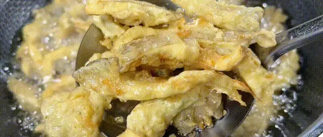 為了達到外焦里嫩的效果,還需復炸一次。將油溫升至七成熱,倒入蘑菇復炸10秒左右,直至金黃酥脆。