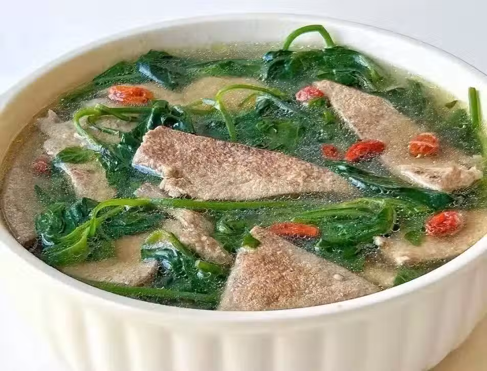 準備食材:枸杞葉1把、瘦肉150g、豬肝200g、生薑3片、蒜、枸杞10g