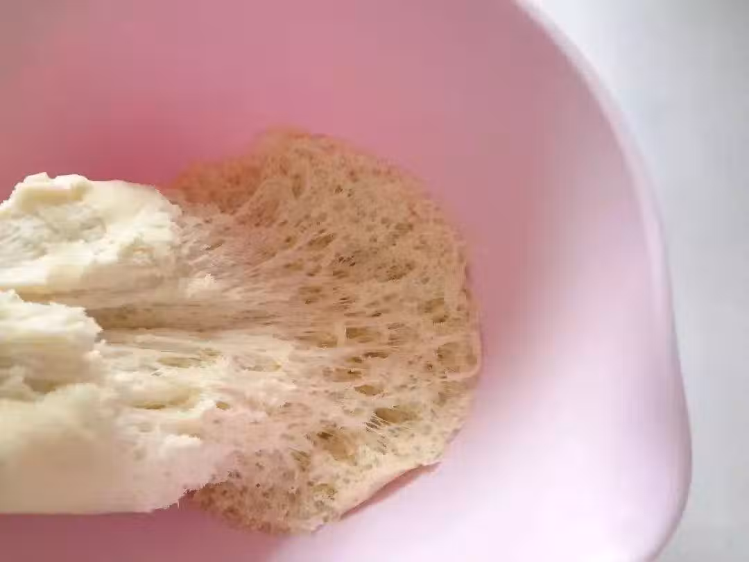 將種麵糰材料放一起揉成無乾粉的麵糰發酵如圖內部組織蜂窩狀