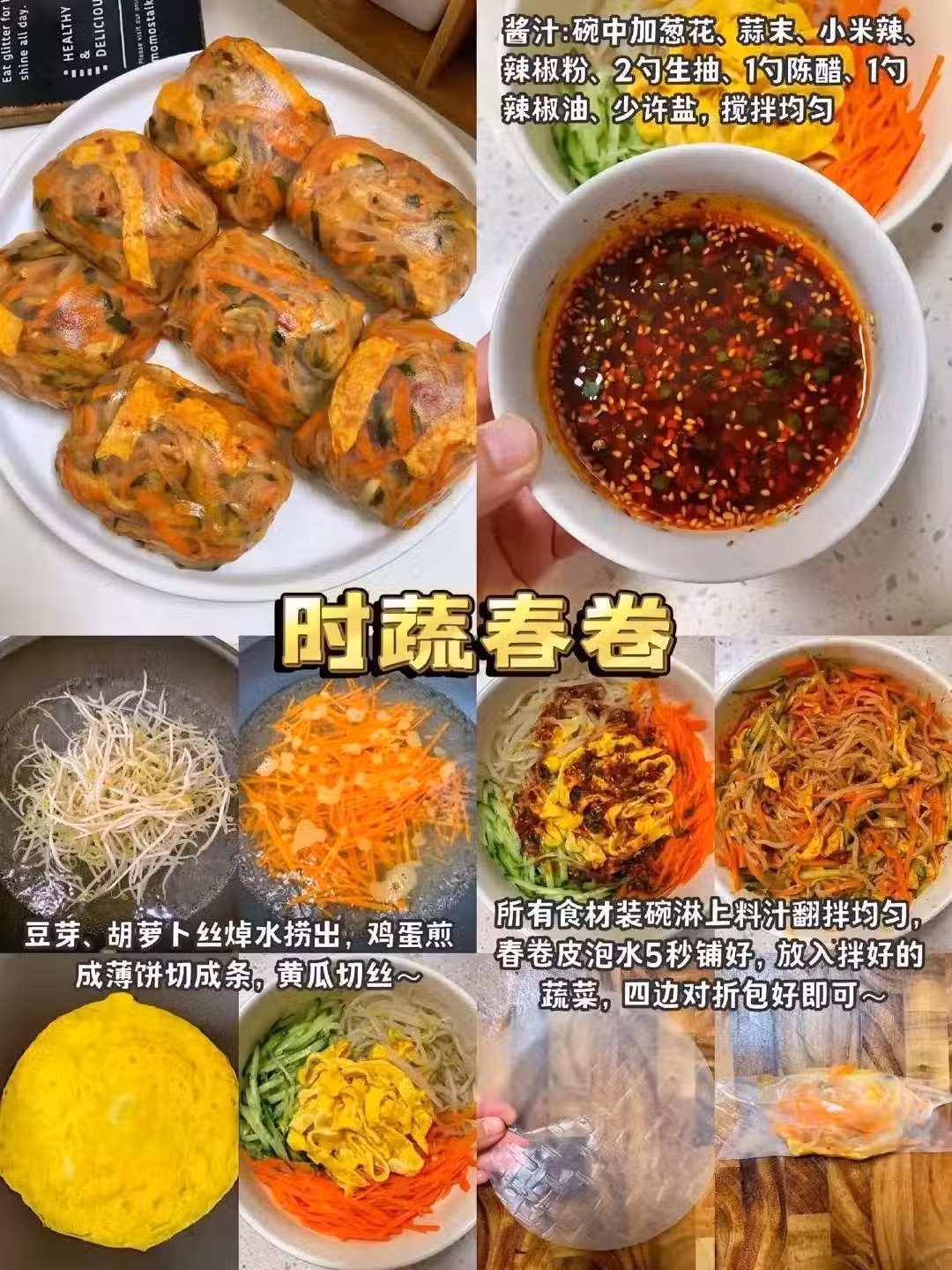 春天吃剩的春卷皮改造計劃。胡蘿蔔黃瓜切絲拌沙拉醬,餃子皮擀薄包菜絲油炸,蘸甜辣醬吃出泰國夜市即視感。
