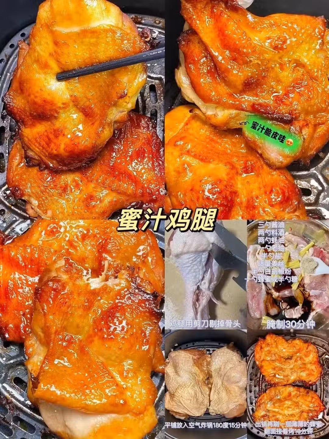 烤箱の高光時刻。雞腿劃刀去骨用料酒,蚝油等腌30分鐘,180度烤15分鐘,翻面刷蜂蜜再烤10分鐘,皮脆肉嫩得想給雞腿頒諾貝爾美味獎。