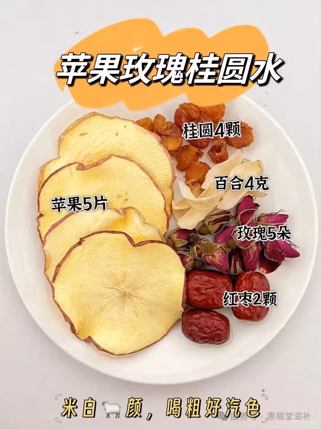 蘋果5片➕桑葚5克➕玫瑰5朵➕紅棗3顆➕枸杞10粒