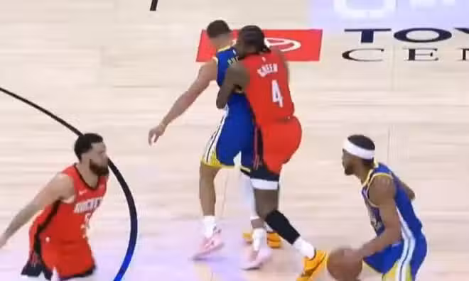 比賽過程當中甚至出現了一個非常搞笑的場面,也是被美國媒體給曬出來了,這是什麼神奇的防守動作呢?當時火箭隊這邊派杰倫格林去糾纏庫里,庫里去給隊友穆迪擋拆,結果路過范弗里特的時候,格林一看庫里過來,也不管手裡拿著球的穆迪了,衝上去就把庫里攔腰抱住。