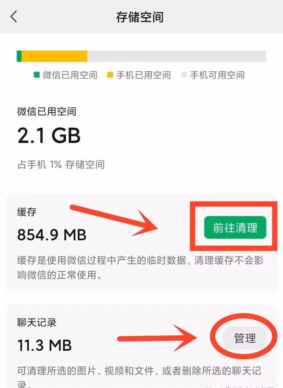 關掉這些設置開關之後,我們再次返回到通用設置裡面,然後選擇存儲空間打開,在存儲空間裡面,我們就可以看到微信所占用的空間了,那麼此時呢,我們首先點擊下面的前往清理,對這些緩存進行清理,我們選擇需要清理的緩存,把它們都勾選中,然後點擊下面的清理,就可以徹底把這些緩存都清理乾淨了!