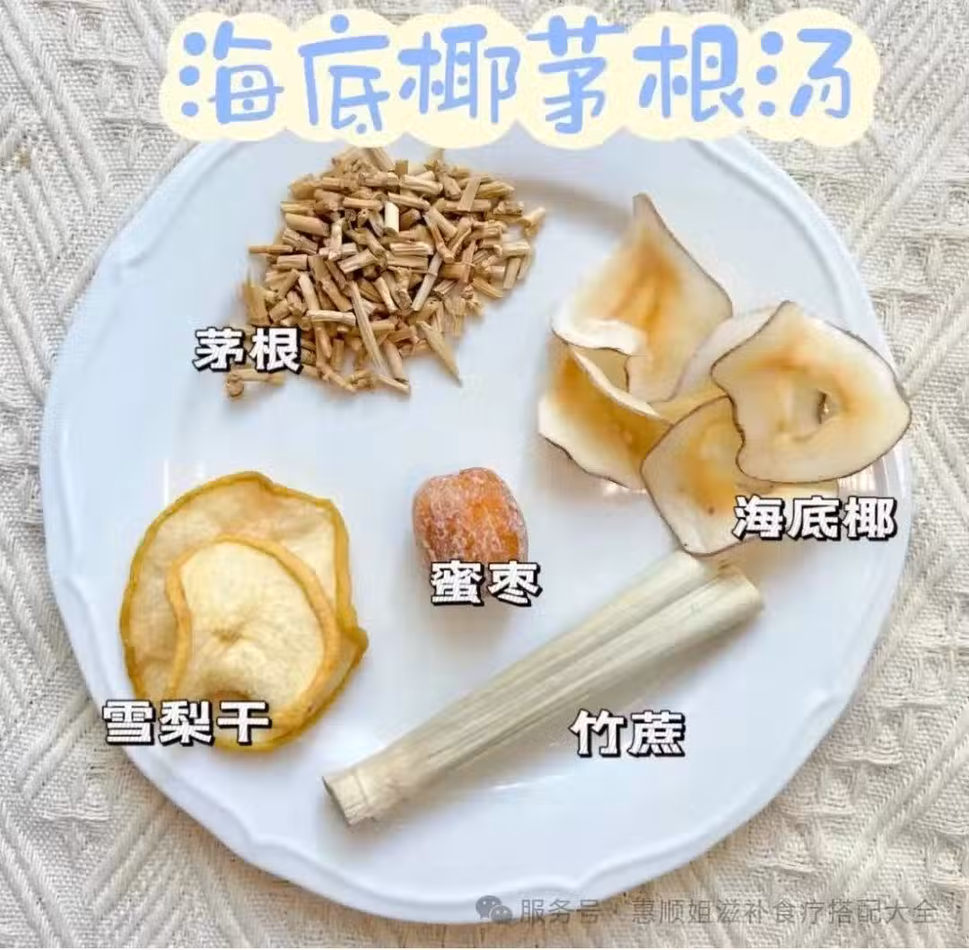 食材:竹蔗100克、茅根10克、蜜棗3顆、海底椰10克、雪梨乾2片