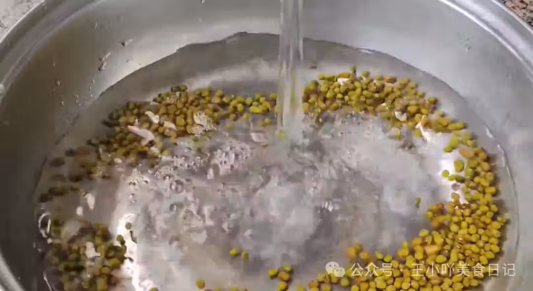 在煮的過程中,可以適時打開蓋子攪拌一下,防止綠豆粘鍋。煮 10 分鐘後,打開蓋子就能看到裡面的湯汁顏色逐漸變深,這說明綠豆的營養已經開始慢慢融入在水中了。